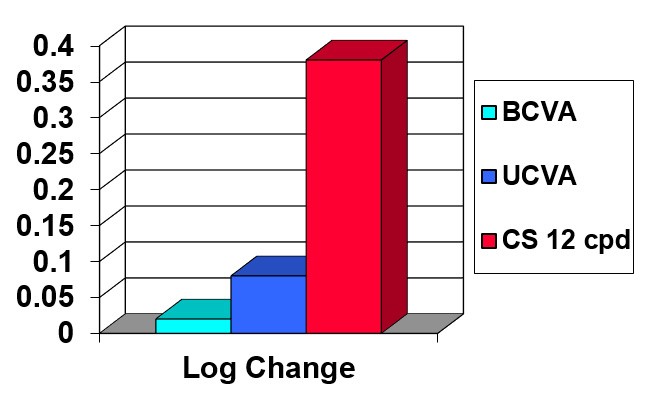 The graph on the right shows the large improvement in vision post PTK as measured on the CSV-1000E. Contrast sensitivity improved across the full range, with the largest improvements, 5 to 6 contrast levels, at 6 and 12 cycles per degree (Rows B and C on the CSV-1000E).